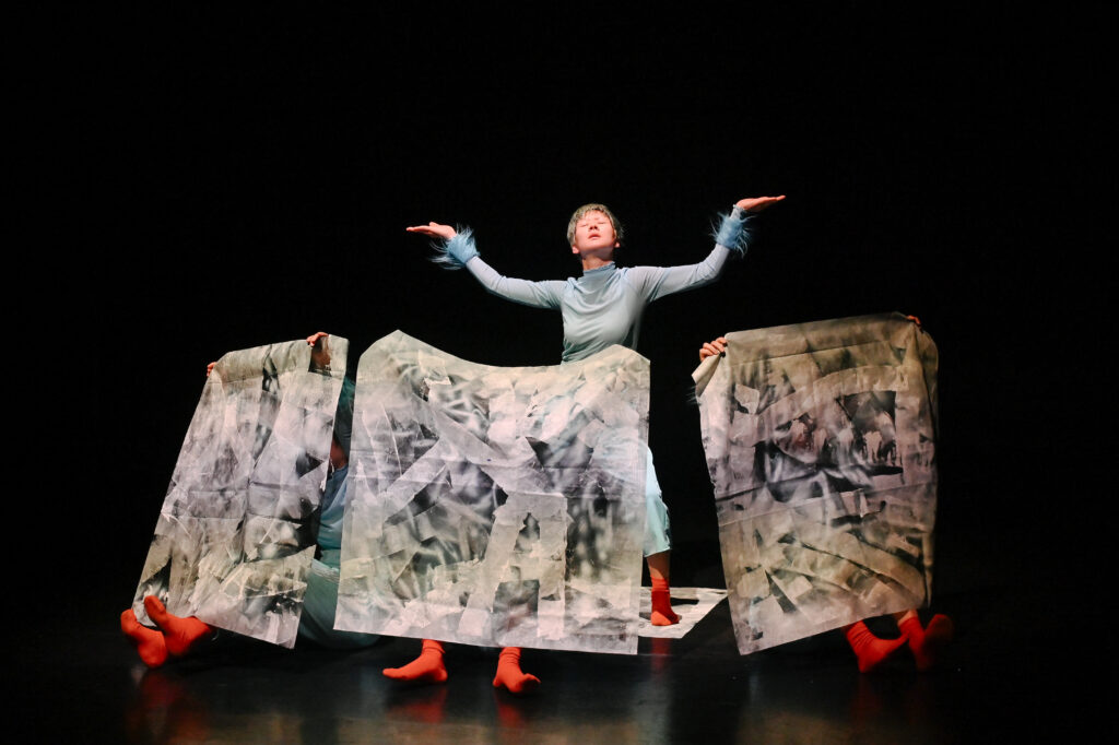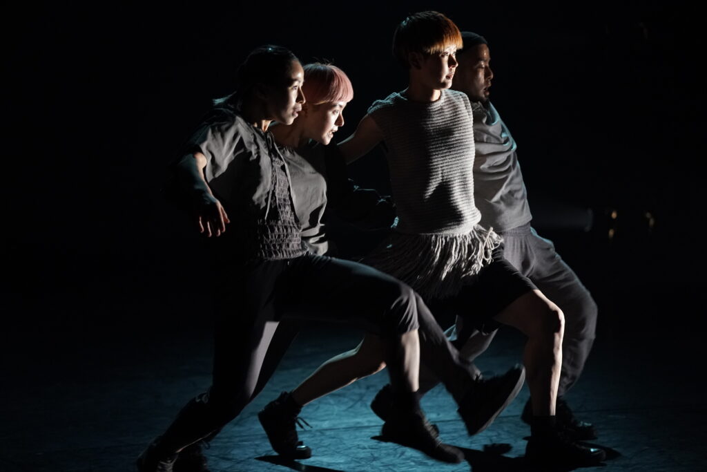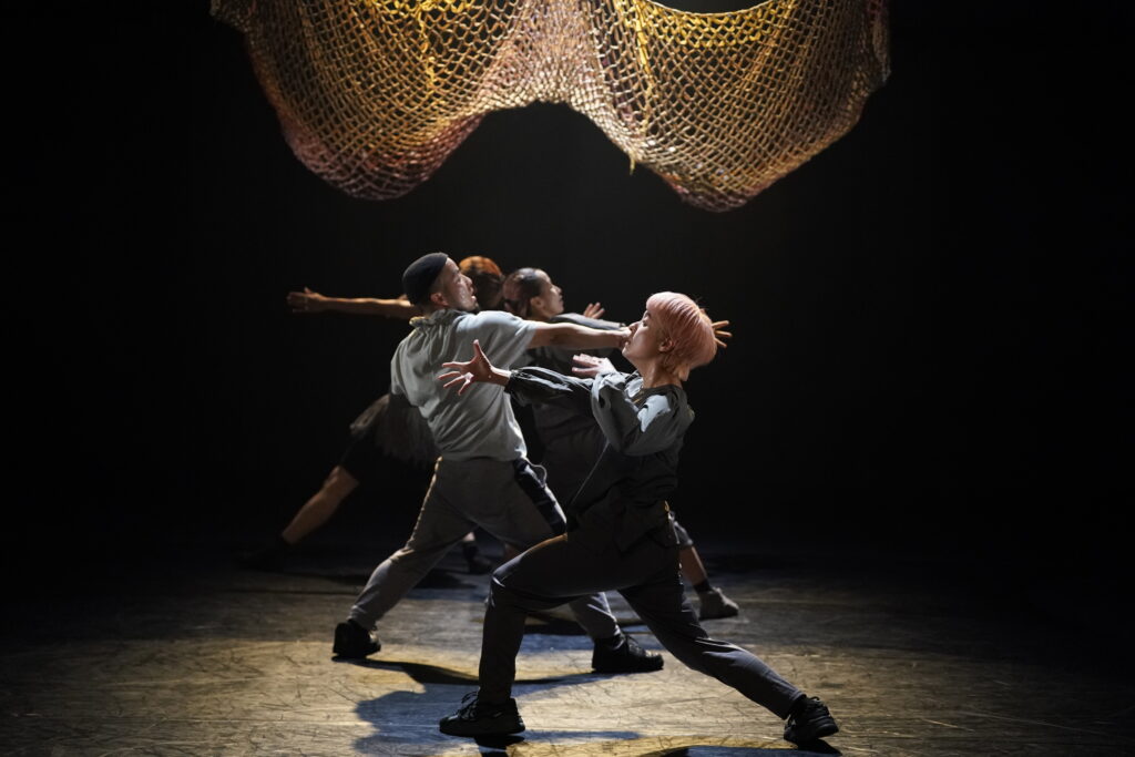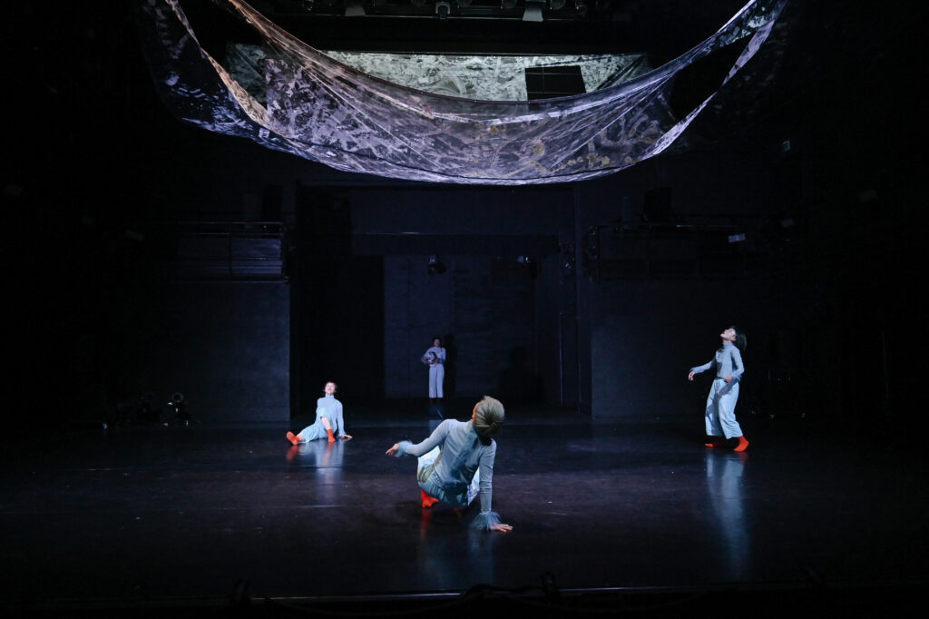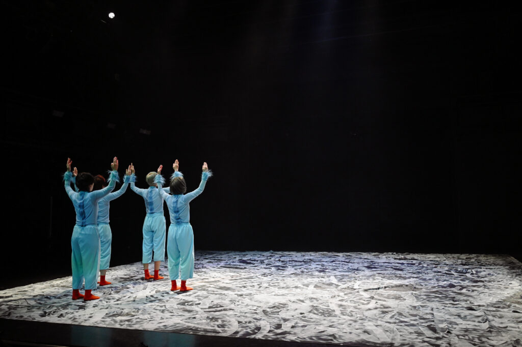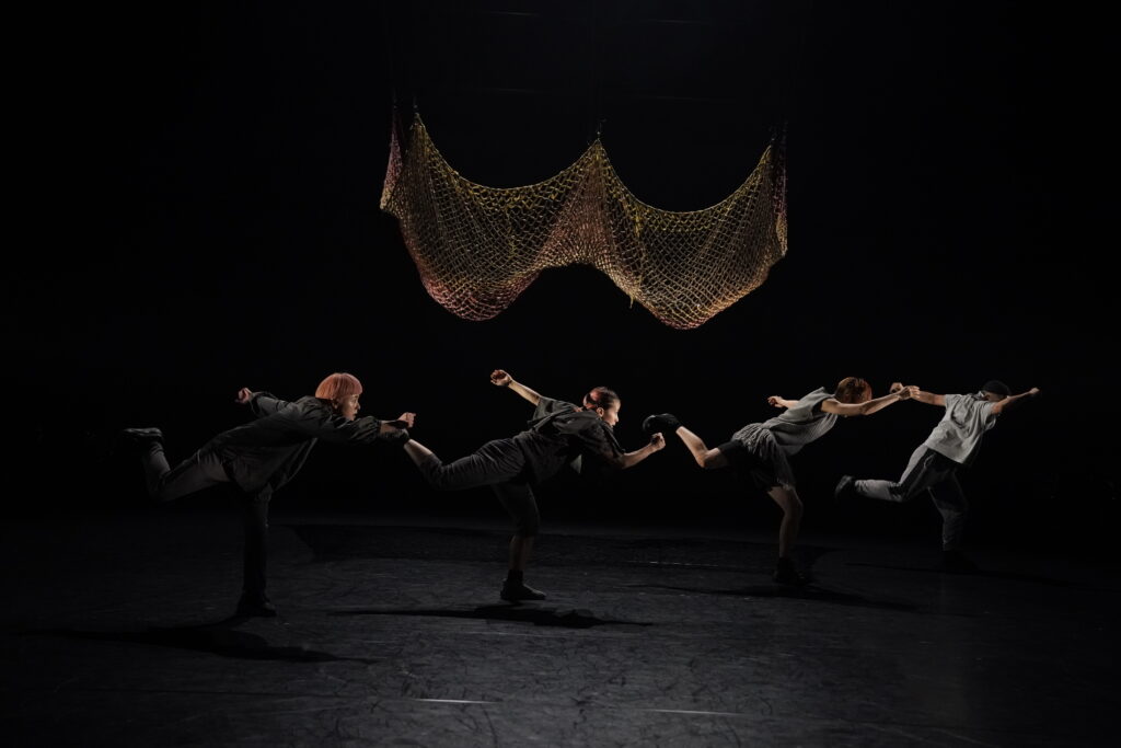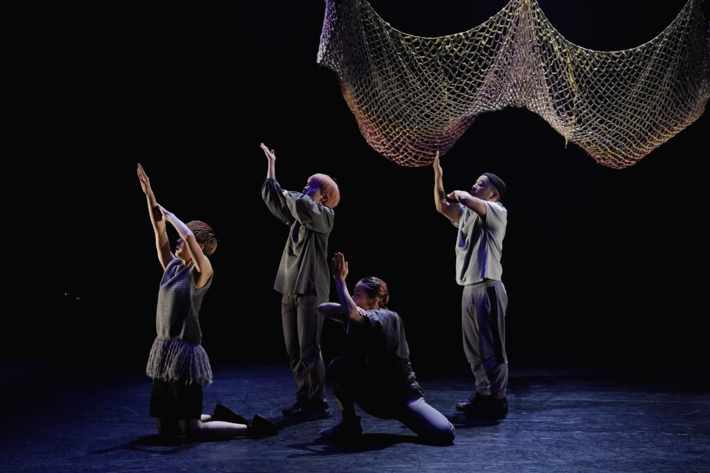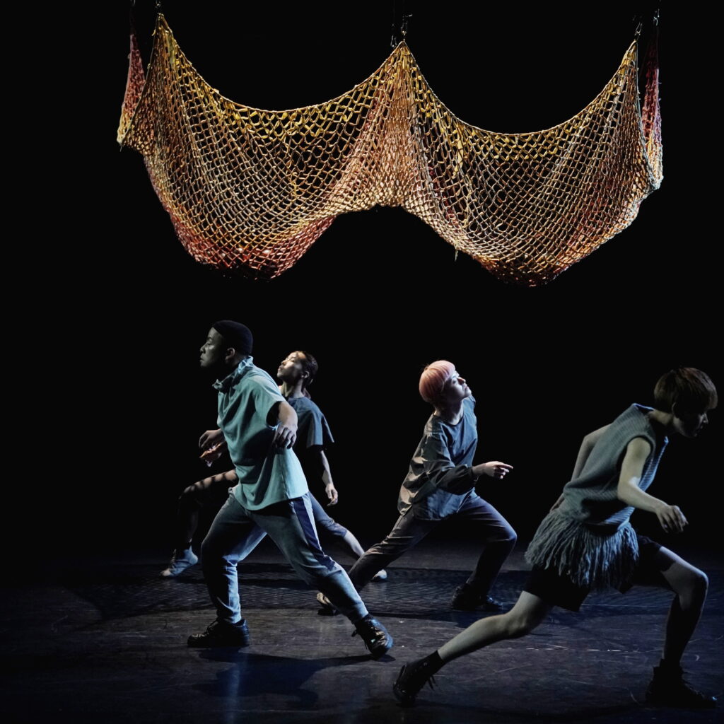 歌が挿入された後、ダンサー全員が靴を手に履き、4足歩行で動き回る。「初めは4本足…」のスフィンクスの謎かけを連想させる。一列に並び、靴を脱ぎ、足元に揃える。入水するかのように舞台奥へ向かっていく。そして再び、漁師網が下ろされるなか、asamicroのソロで幕を閉じる。胎児が次第に老い、死に向かっていく。朝起きた人が、再び眠りに着く。潮が満ち、そして引く。