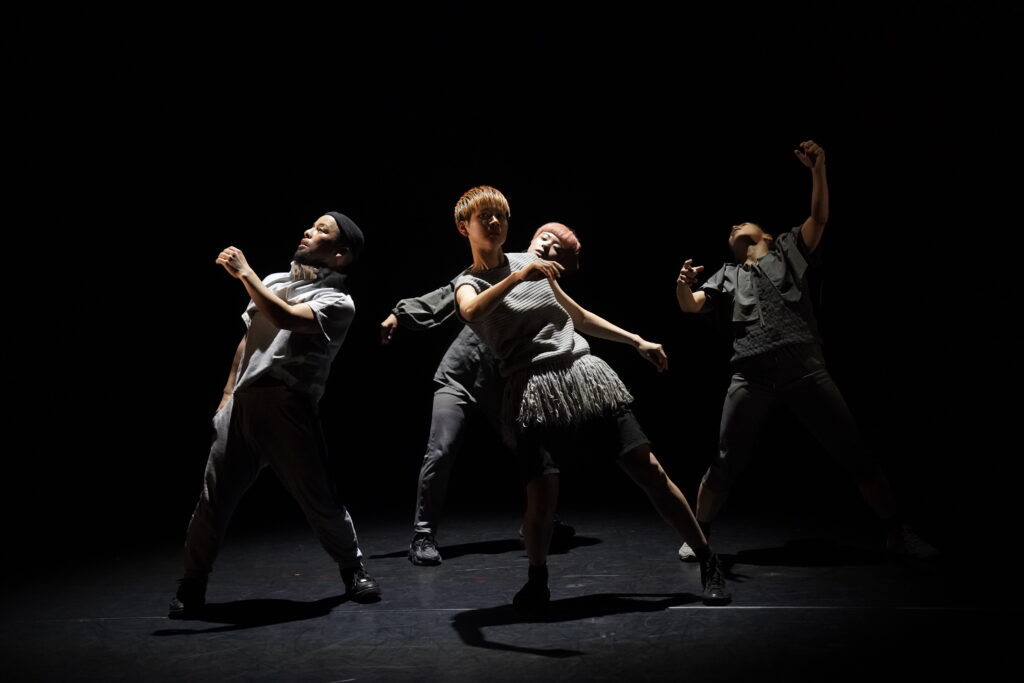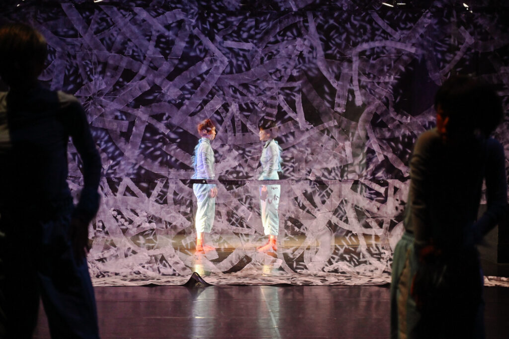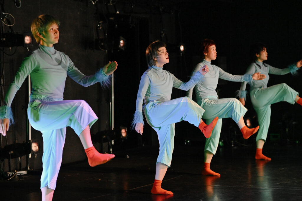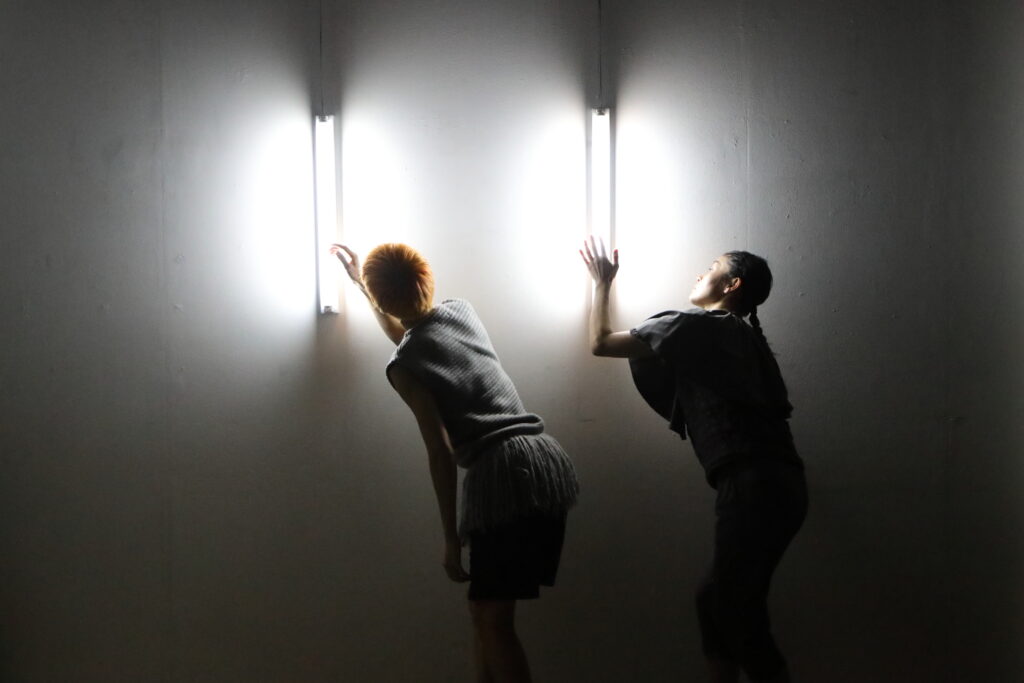 北川結と山中芽衣のデュオが続く。身体の制約そのものを踊るような、ユーモラスな動き。しかし、明滅する蛍光灯の光のなか、どこか不穏な空気が張り詰める。二人が首を大きくかきむしり、手に吐き出した何かを客席に見せびらかす振り付けを反復し始めると、不穏さの予感が確信に変わる。会場の奥、壁に向かって設置された小さな階段をゆっくりと登り、倒れ、床を転がる。それを繰り返す二人。反復するほど背中が折れ曲がって疲弊していくその姿は、老い行く身体の表象にも見える。