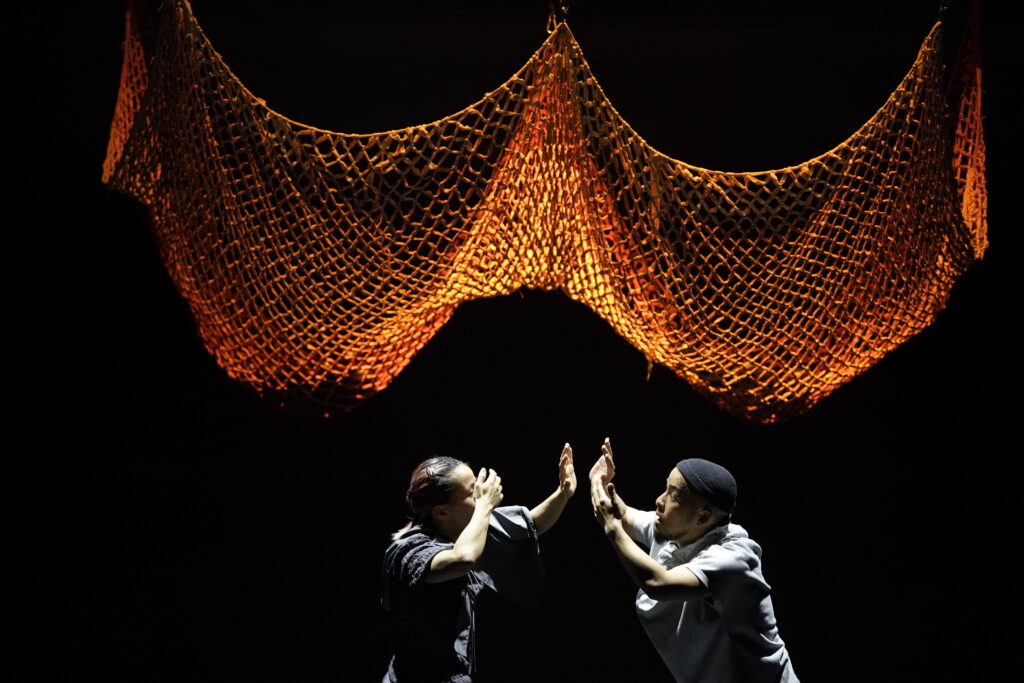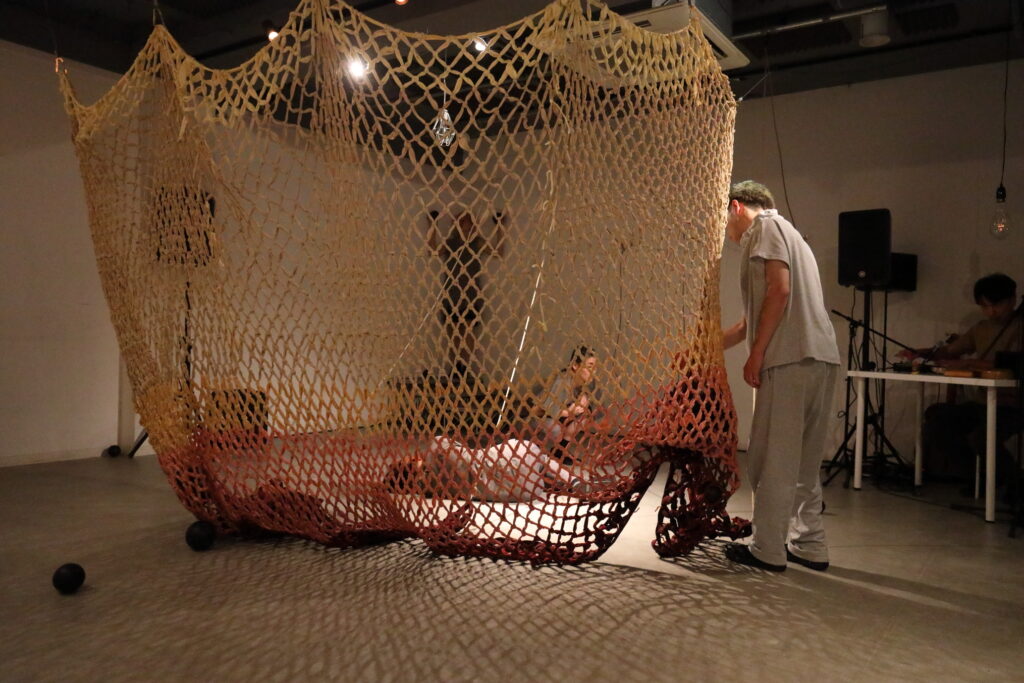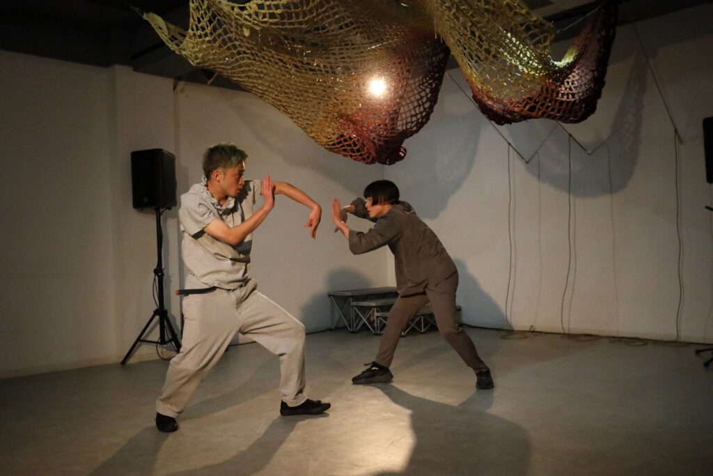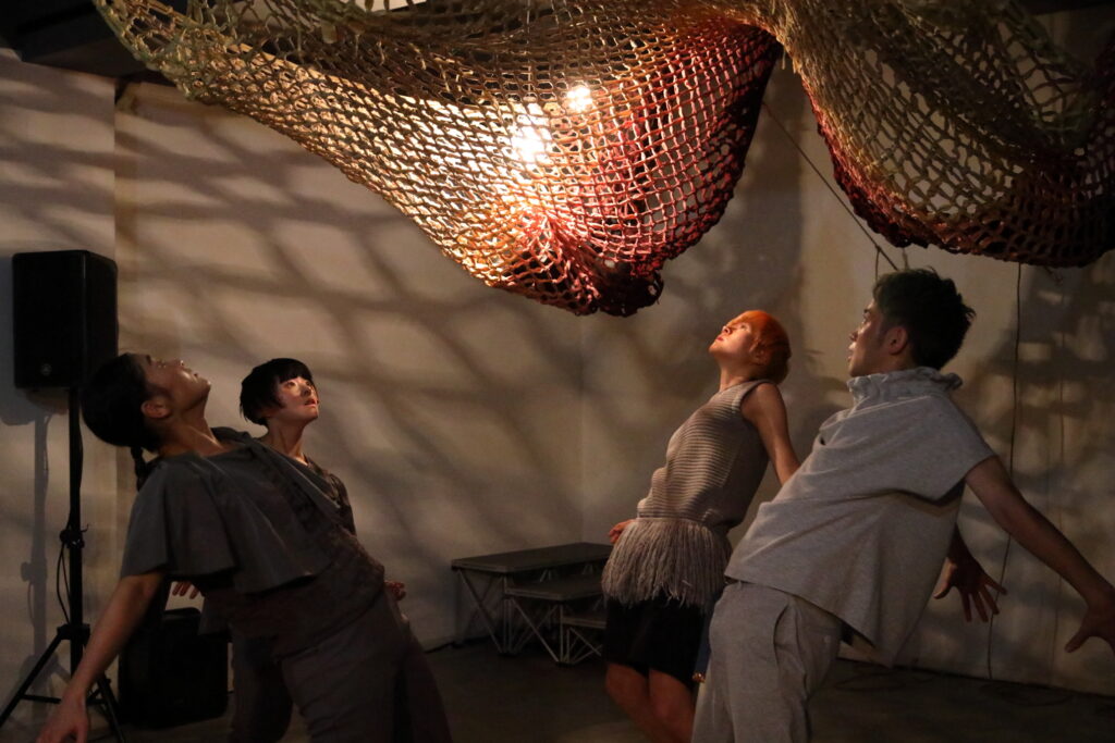 『海におはぎを投げる日』はまず、asamicro のソロで幕を開ける。緞帳幕のように天井から吊るされた網。それがゆっくりと持ち上がるなか、波の音が聞こえてくる。おそらく小豆で奏でる波ざるの音だ。海に「おはぎ」を捧げるのは、もしかすると、小豆のさらさらという音の連想があるかもしれない。集めると、海のような音を奏でる実り。それを海に還すことで、また豊穣を祈願する。胎児のような姿から徐々に動き出す。asamicroが他の作品でもモチーフにしている、朝、目覚める人の姿でもあるだろう。どこか神楽や日本舞踊を思わせる水平的な動き。強固な上半身、低い重心。抑制された動きから徐々に、急ブレーキをかけながら観客を軽やかに裏切るヒップホップの身体性が現になってくる。