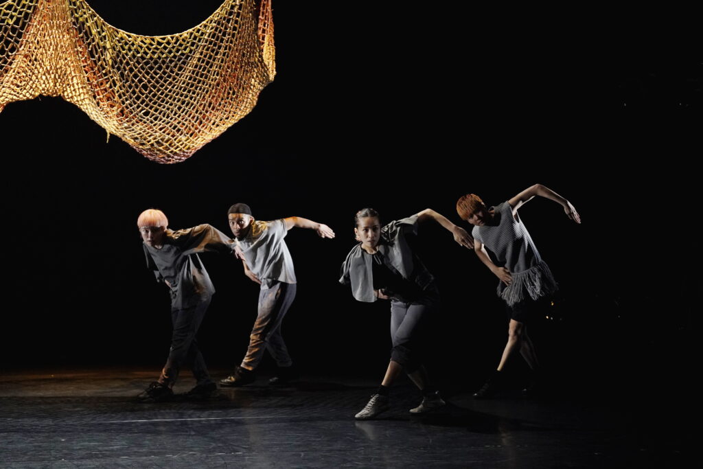 歌が挿入された後、ダンサー全員が靴を手に履き、4足歩行で動き回る。「初めは4本足…」のスフィンクスの謎かけを連想させる。一列に並び、靴を脱ぎ、足元に揃える。入水するかのように舞台奥へ向かっていく。そして再び、漁師網が下ろされるなか、asamicroのソロで幕を閉じる。胎児が次第に老い、死に向かっていく。朝起きた人が、再び眠りに着く。潮が満ち、そして引く。