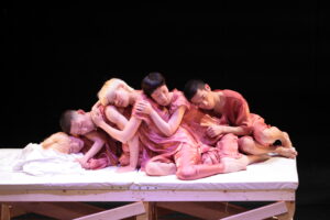 歌が挿入された後、ダンサー全員が靴を手に履き、4足歩行で動き回る。「初めは4本足…」のスフィンクスの謎かけを連想させる。一列に並び、靴を脱ぎ、足元に揃える。入水するかのように舞台奥へ向かっていく。そして再び、漁師網が下ろされるなか、asamicroのソロで幕を閉じる。胎児が次第に老い、死に向かっていく。朝起きた人が、再び眠りに着く。潮が満ち、そして引く。